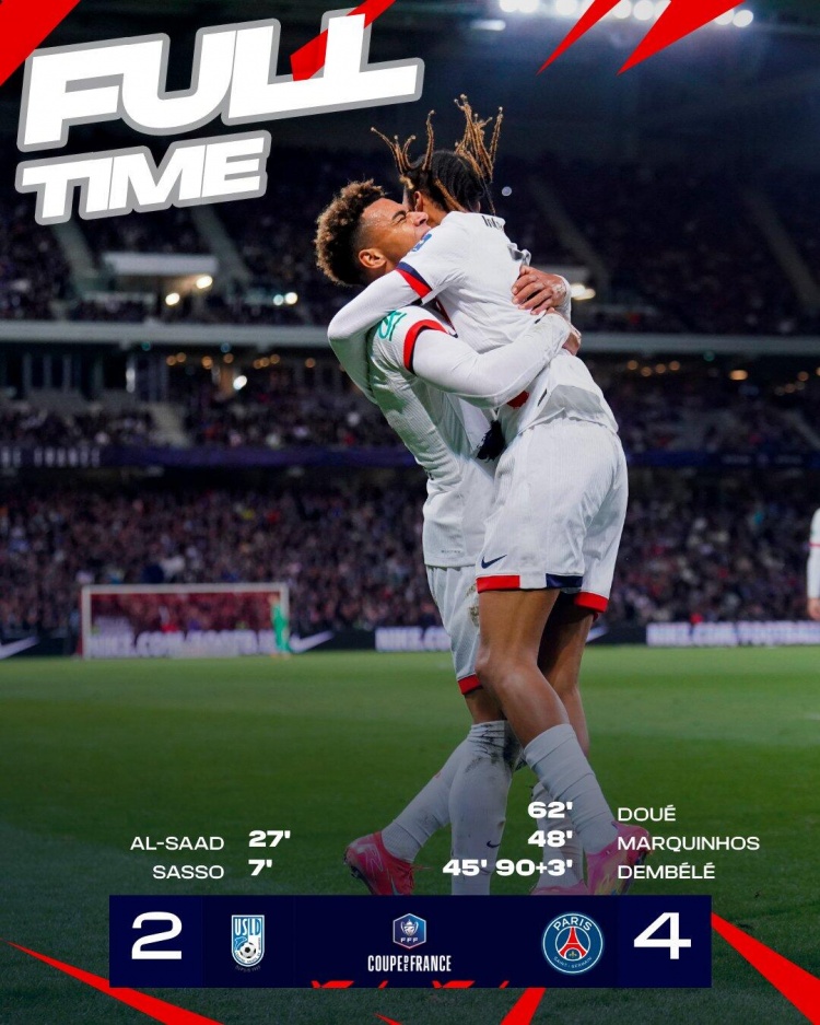 让二追四!法国杯-巴黎4-2敦刻尔克进决赛 登贝莱2射1传杜埃破门