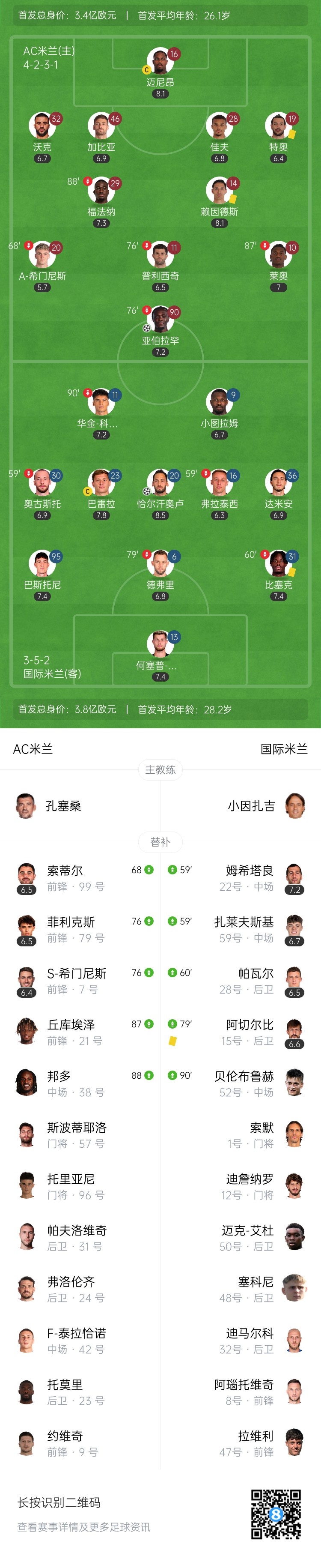 下半场补时3分钟。最终全场比赛结束,米兰1-1国米。