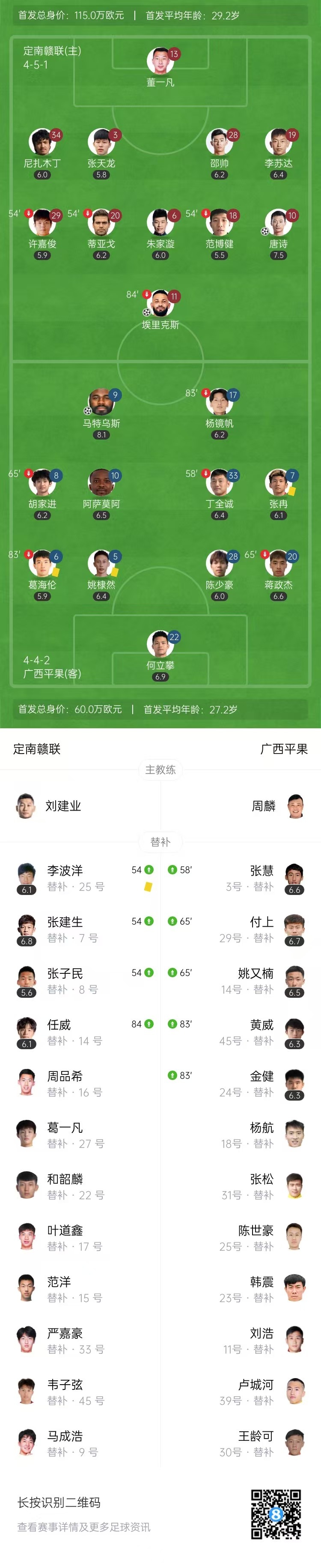 第80分钟,唐诗任意球直接破门扳平比分,定南赣联2-2广西平果。↓