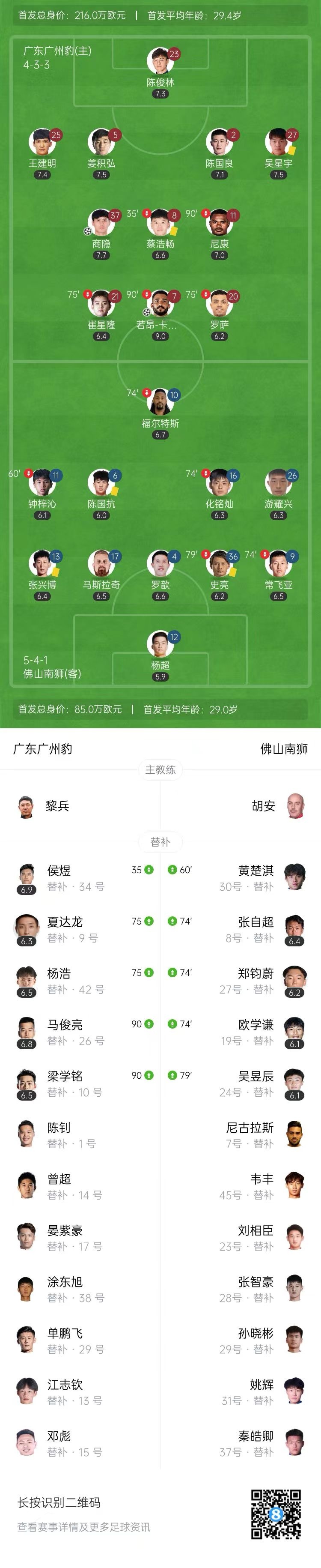 4月27日讯 北京时间4月27日19:30,中甲第6轮,广东广州豹坐镇主场广州越秀山体育场迎战佛山南狮。上半场,福尔特斯、崔星隆接连错失空门机会。下半场,若昂-卡洛斯头槌打破僵局,后助攻商隐扩大比分。全场比赛结束,广东广州豹主场2-0力克佛山南狮,积13分仍居第4位,落后榜首的重庆铜梁龙3分。