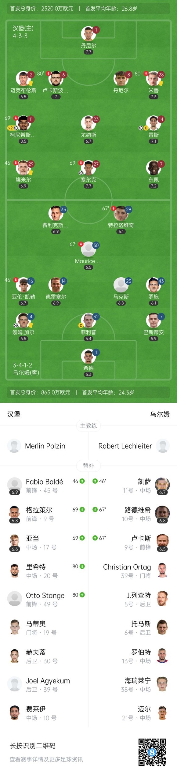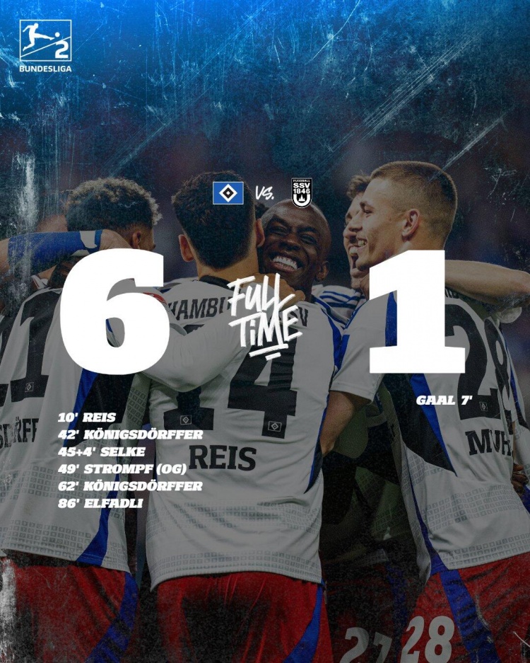 下半场没有补时,汉堡6-1乌尔姆。