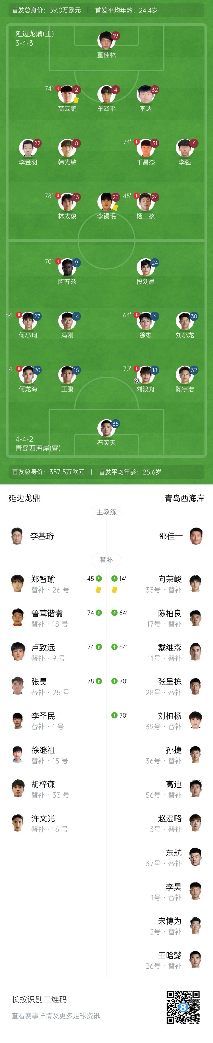 第53分钟,西海岸打破场上僵局,冯刚开出左路角球,刘浪舟高高跃起头球破门,西海岸1-0领先延边龙鼎。↓