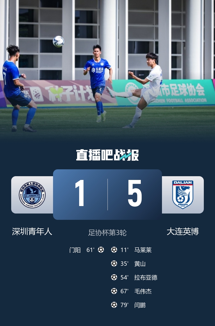 全场比赛结束,最终大连英博5-1深圳青年人。