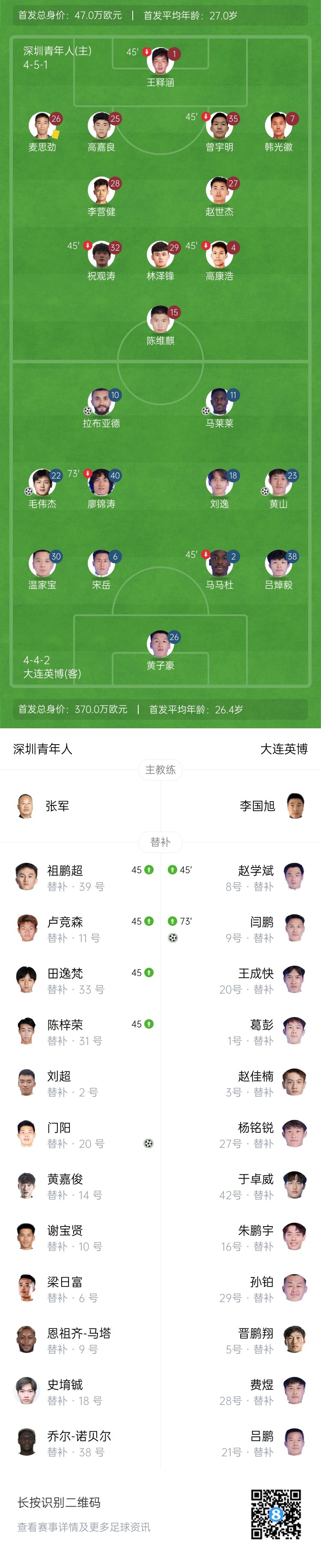 上半场伤停补时2分钟,半场结束,大连英博暂2-0深圳青年人。