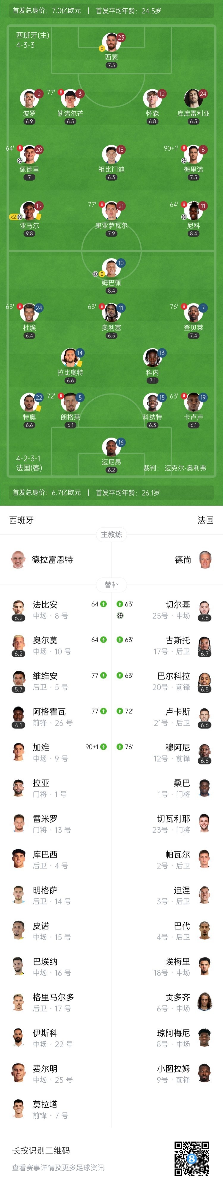 第22分钟,亚马尔右路送出横传,奥亚萨瓦尔禁区内背身拿球再做给身边的队友,尼科-威廉姆斯一脚爆射攻破迈尼昂十指关,西班牙1-0法国。↓