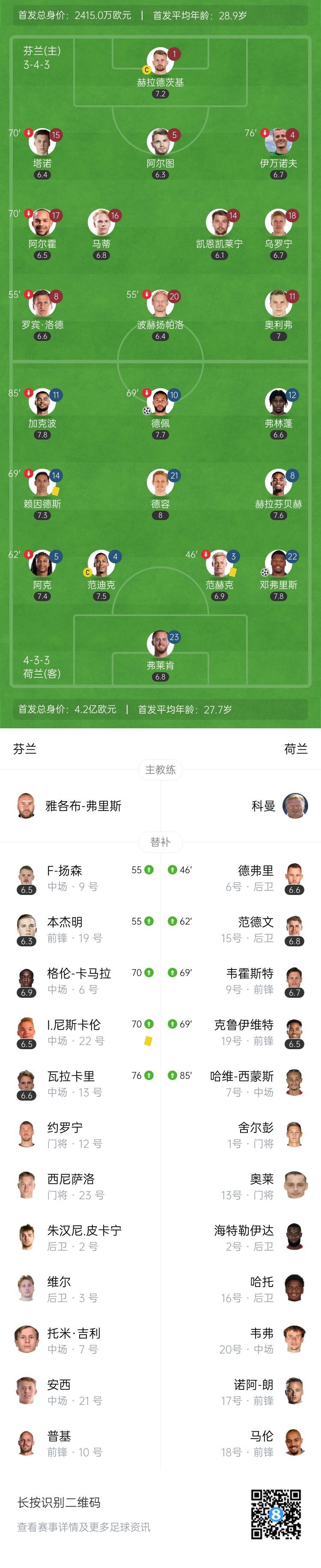 6月8日讯 世预赛欧洲区小组赛G组第3轮,荷兰作客赫尔辛基奥林匹克体育场挑战芬兰。上半场,德佩闪击破门,邓弗里斯再下一城。易边再战,荷兰多次造险。最终芬兰0-2荷兰。积分榜方面,荷兰世预赛首战开门红,芬兰3轮4分。