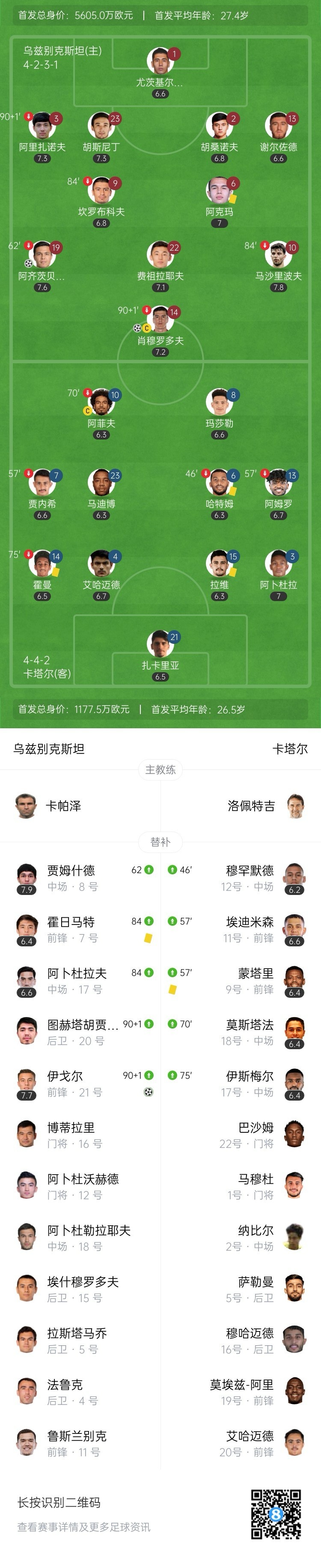 第86分钟,乌兹别克斯坦扩大优势,伊斯坎德罗夫中线附近长传,肖穆罗多夫右脚卸下皮球后,左脚抽射破门,乌兹别克斯坦2-0领先卡塔尔。↓