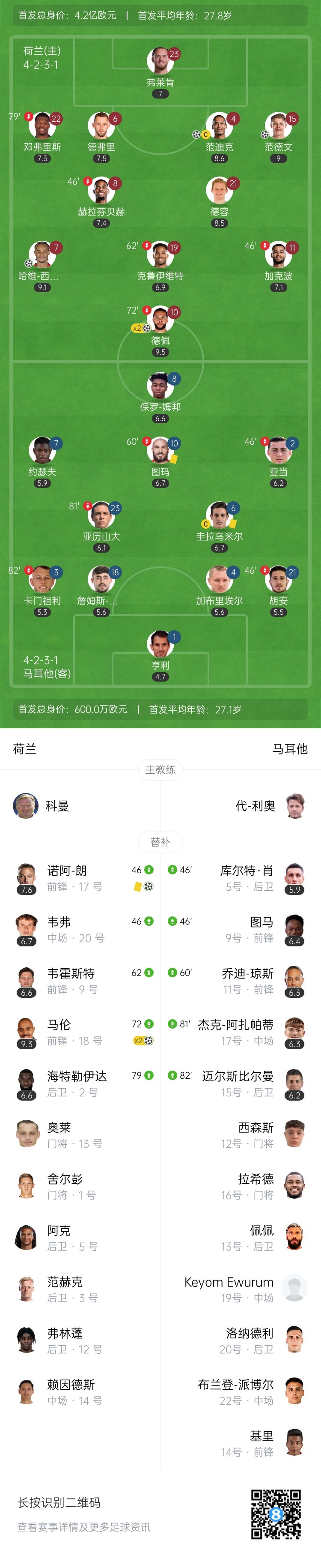 6月11日讯 世预赛欧洲区小组赛G组第4轮,荷兰坐镇主场欧罗堡球场迎战马耳他。上半场,德佩点射+双响追平范佩西并列队史射手王,范迪克远射破门。易边再战,哈维-西蒙斯破门、马伦双响、诺阿-朗建功荷兰6分钟3球,最后时刻范德文锦上添花。最终荷兰8-0马耳他。积分榜方面,荷兰前两轮全胜6分,马耳他4轮1分。