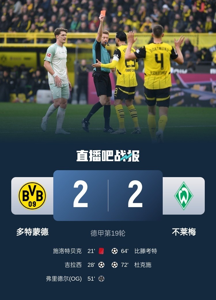 1月26日讯 北京时间1月25日晚上22:30,德甲第19轮,多特蒙德坐镇伊杜纳信号公园球场迎战不莱梅。上半场,施洛特贝克直红,布兰特助攻吉拉西进球。下半场,吉拉西造弗里德尔乌龙,比当古世界波,杜克施扳平。全场结束,十人多特蒙德2-2不莱梅。
