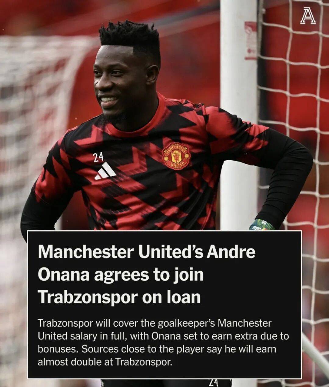 据TA的报道,特拉布宗体育将全额承担这位门将在曼联的薪水,此外奥纳纳还可获得奖金收入,其最终收入近乎翻倍。