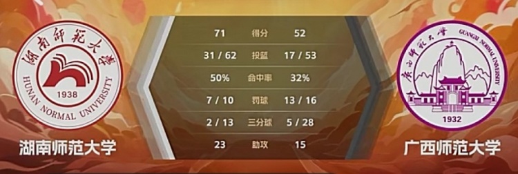 第四节,湖南师大内外开花先拿5分,随后双方围绕10分分差展开激烈争夺,马艺庭连中两球带队扩大优势,广西师大后劲不足,湖南师大稳扎稳打将优势保持到最后。最终,湖南师大71-52击败广西师大。