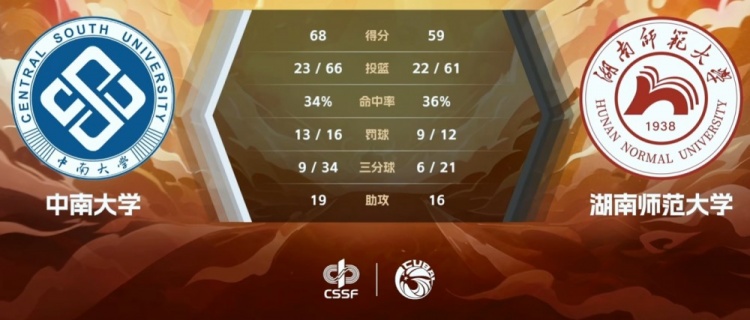 末节范雨萌两记三分手感出色,田媛媛则助攻、抢断、得分一把抓,中南大学送上12-5的攻势将优势扩大至16分;湖南师大攻防都出现问题,暂停回来局面仍然没有改观,范雨萌再度命中三分将杀死比赛悬念。最终,中南大学68-59力克湖南师范大学拿下比赛。