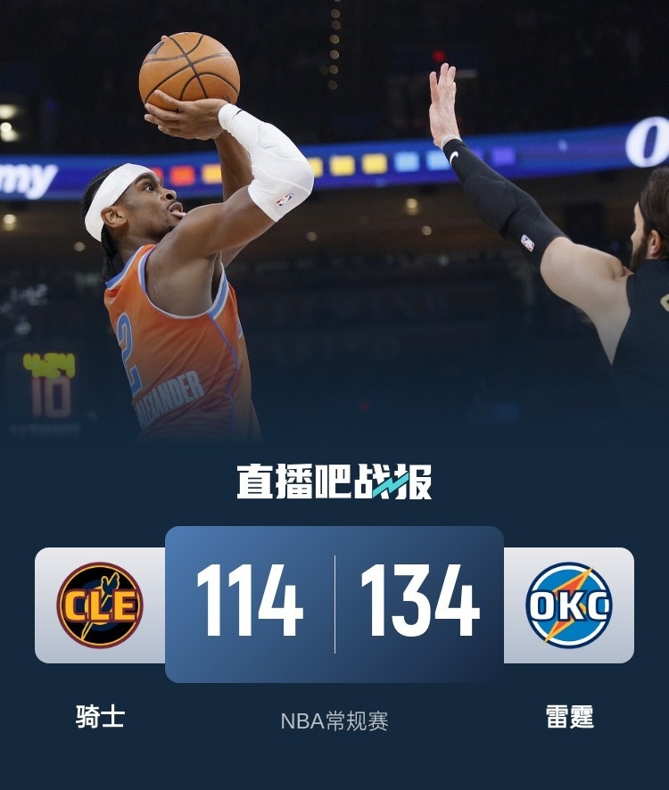 首节之争雷霆在开局打得稍显被动并早早叫了暂停,但也正是这个暂停帮助他们在随后接管比赛,亚历山大连拿6分开了一个好头,雷霆随后轰出一波跨节30-2的攻势直接打垮骑士防线;骑士作为进攻端最强的球队长达6分钟里仅得2分;次节骑士虽然找到进攻状态单节轰出38分,但雷霆有如神助狂轰43分,亚历山大半场15投10中砍下26分,雷霆半场三项命中率60.9%+57.9%+100%可谓弹无虚发并带着23分领先进入下半场。休息归来依旧是有进攻没防守的状态,这一节他们又一次轰出32分但却丢了44分,雷霆几乎弹无虚发的进攻打得骑士完全没有办法,末节双方早早鸣金收兵宣告进入垃圾时间。最终,雷霆主场复仇骑士,并终结骑士对阵西部球队11胜0负的不败金身。
