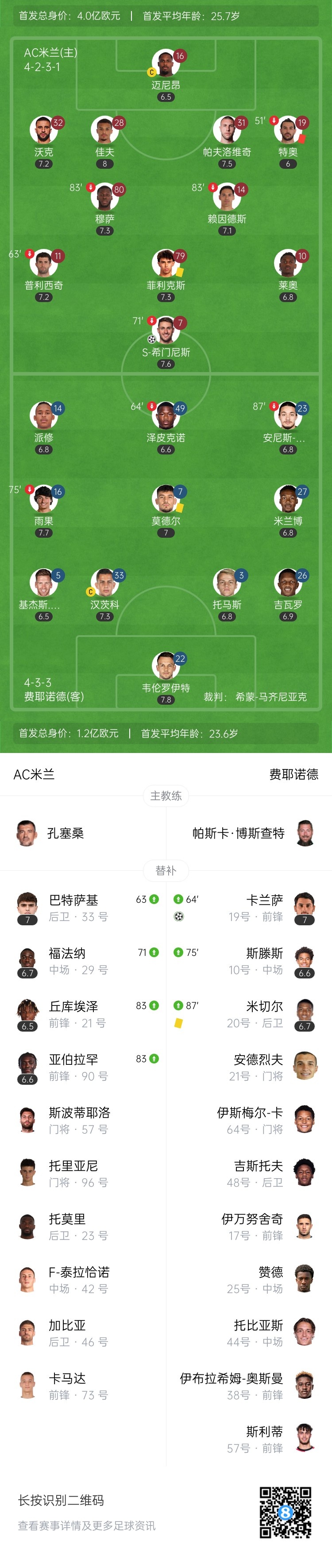 开场第1分钟,AC米兰战术角球,皮球开到后点,佳夫头球顶到门前,S-希门尼斯接力将球顶进球门!AC米兰1-0领先费耶诺德,总比分扳成1-1↓