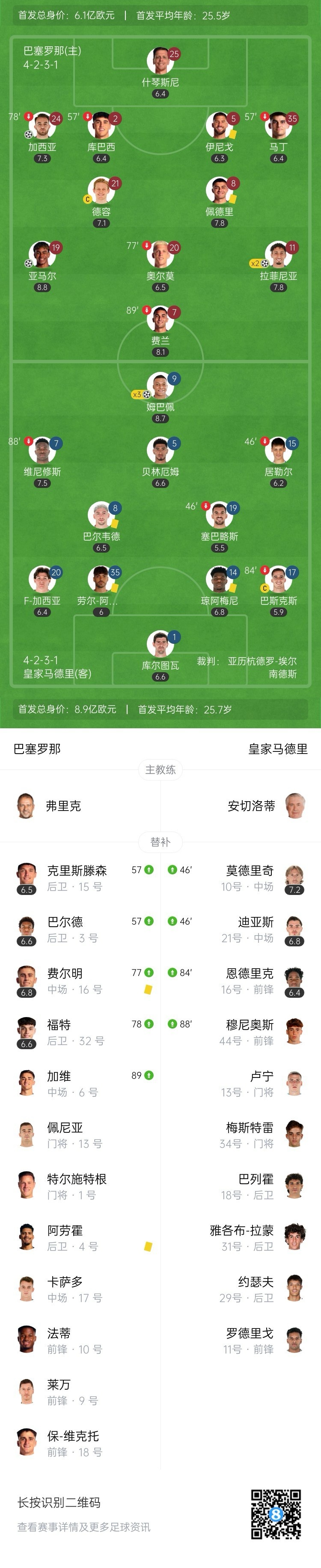 全场比赛结束,巴塞罗那主场4-3战胜皇家马德里。