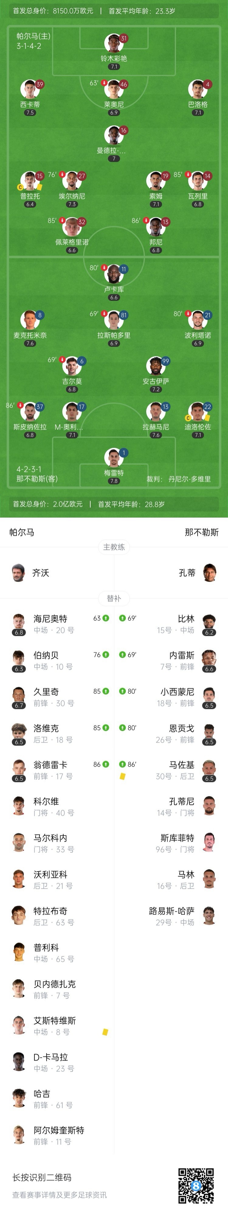 全场比赛结束,那不勒斯客场0-0战平帕尔马1分领跑。