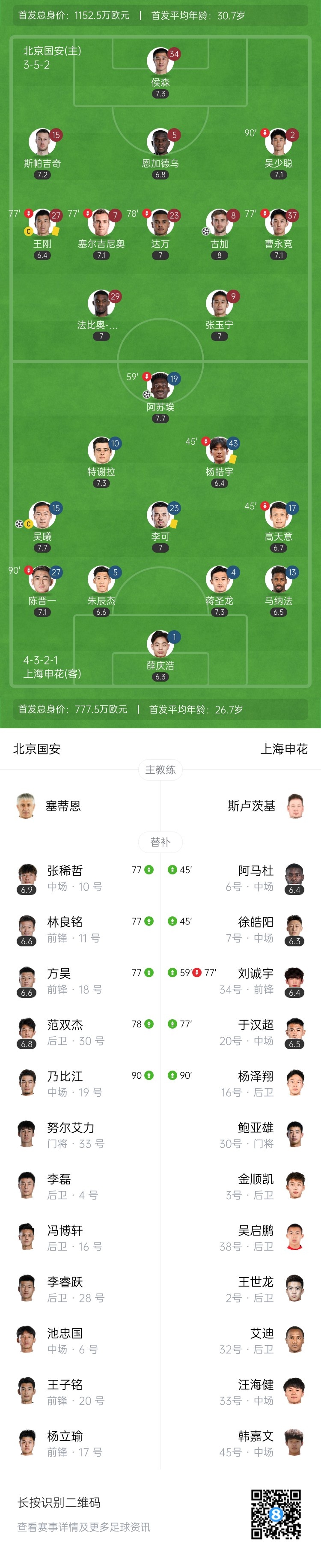 下半场伤停补时7分钟,全场比赛结束,最终北京国安1-2上海申花。