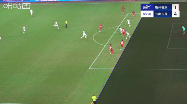 第90+5分钟,云南玉昆门将余鉴贤持球时间过长,主裁判判给梅州客家一个角球↓