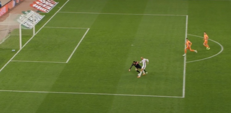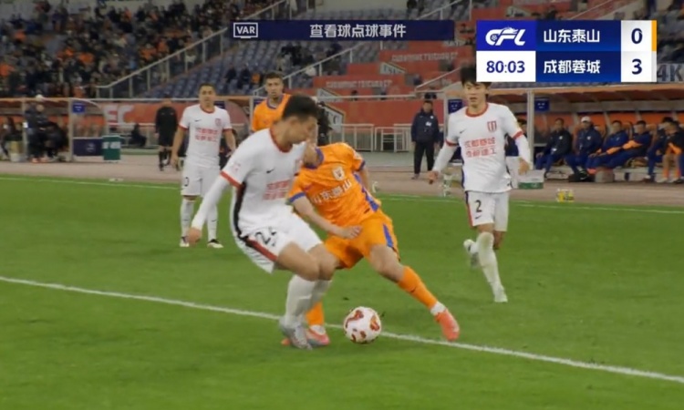 第80分钟,刘洋杀入禁区后和李扬发生对抗倒地,主裁判第一时间判罚点球,但经VAR回放后将点球取消。↓