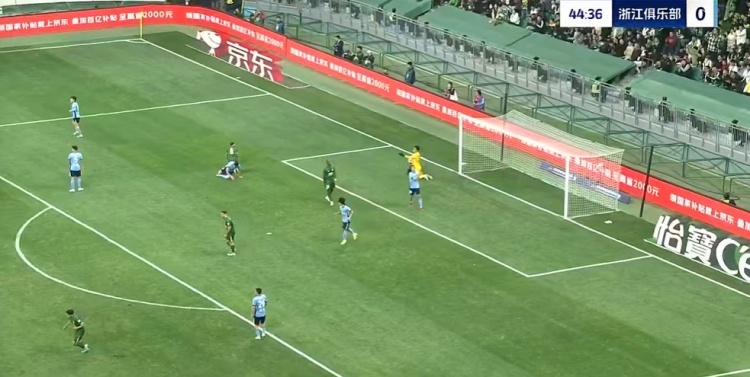 第45+2分钟,浙江队大禁区左侧定位球机会,李提香主罚开到后点,卢卡斯高高跃起顶出弹地球没有力量,门将轻松没收↓