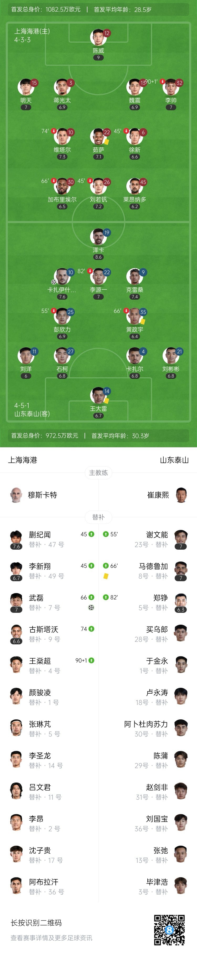 全场比赛结束,上海海港主场1-1战平山东泰山。