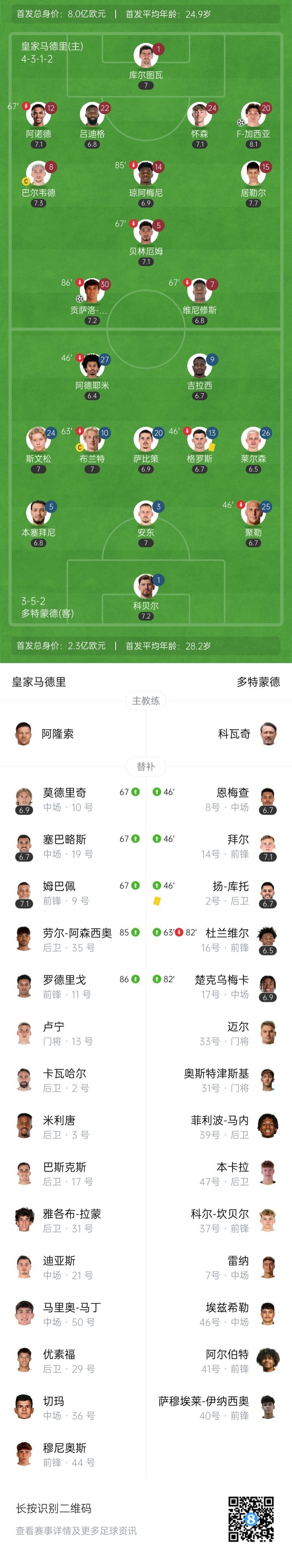 下半场补时5分钟。最终全场比赛结束,皇马3-2多特。