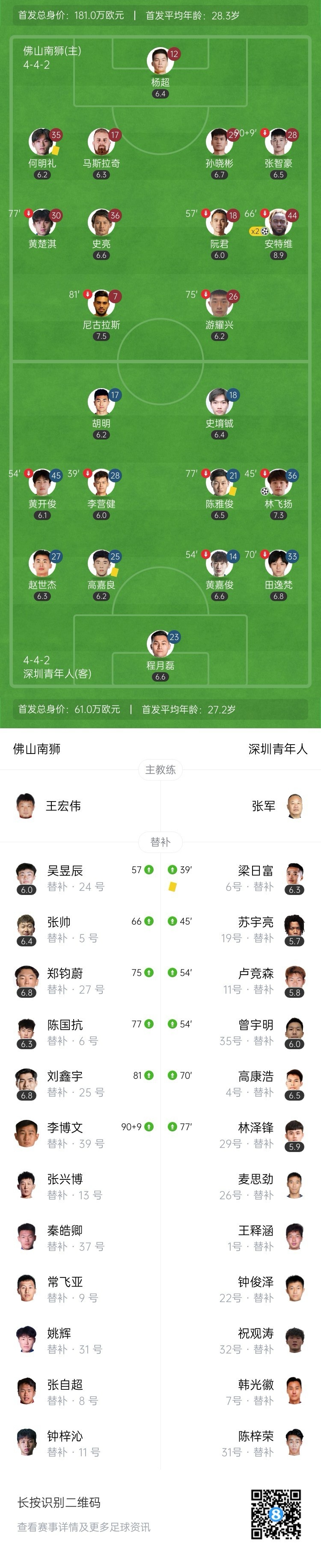 上半场补时第4分钟,深圳青年人右路传中,林飞扬中路包抄门前推射破门,深圳青年人1-2落后佛山南狮。↓
