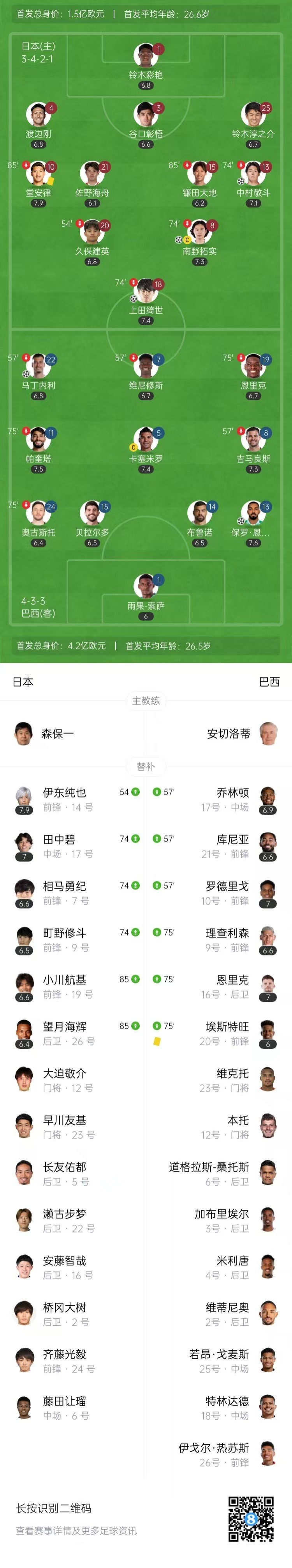 让二追三!日本3-2历史首胜巴西,布鲁诺两送礼伊东纯也替补两助