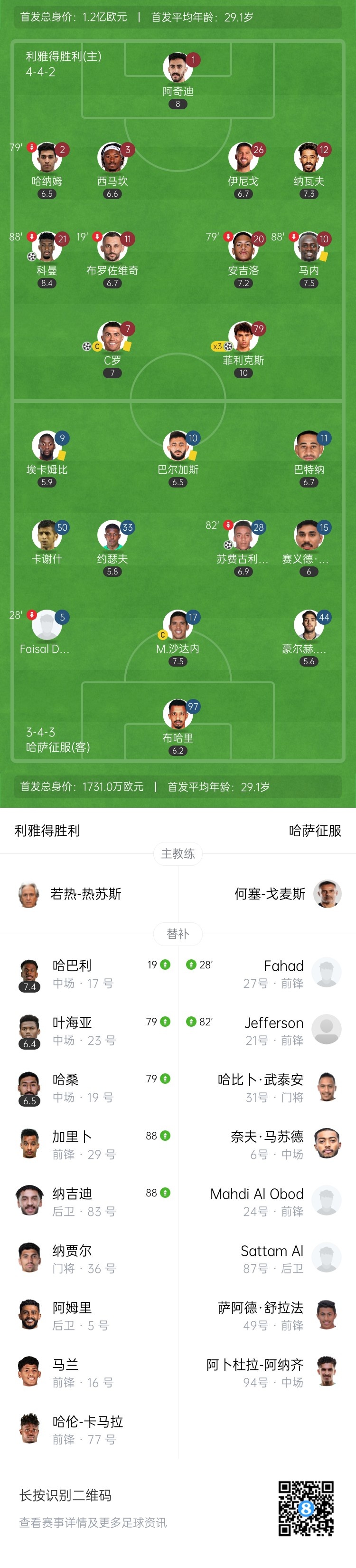 下半场补时3分钟。最终全场比赛结束,利雅得胜利5-1哈萨征服。