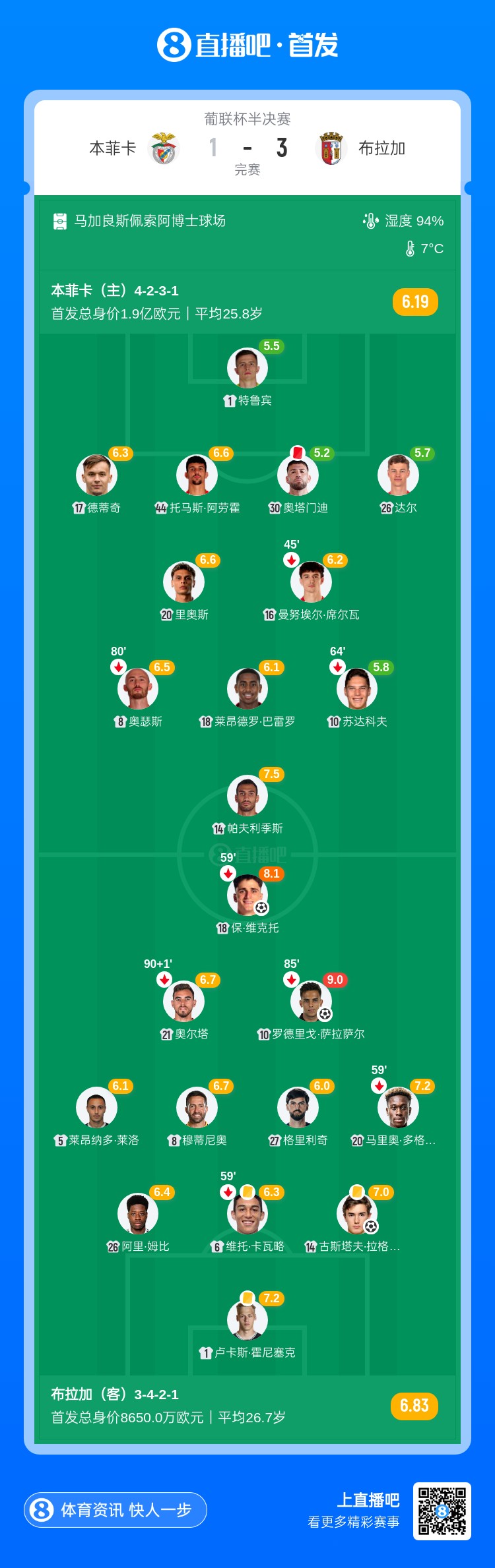 无缘葡联杯决赛!本菲卡1-3布拉加 萨拉萨尔一条龙奥塔门迪染红