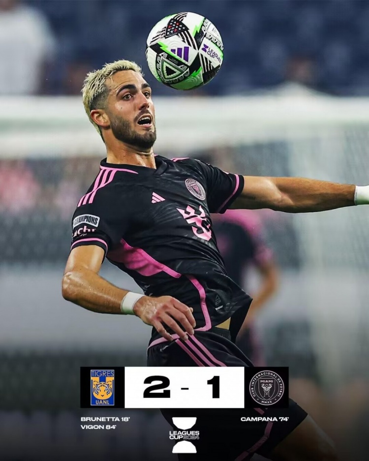 8月4日讯 北京时间8月4日8:00,联盟杯小组赛K组卫冕冠军迈阿密国际挑战老虎大学的比赛,上半场布鲁内塔凌空斩首开记录,坎帕纳失半单刀,半场结束,迈阿密国际0-1老虎大学。下半场坎帕纳造点+点射扳平比分,比贡抽射破门反超比分,最终迈阿密国际1-2老虎大学,迈阿密国际小组第二将携手老虎大学晋级32强。