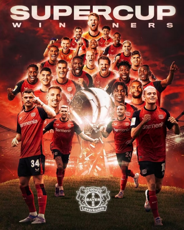 8月18日讯 北京时间8月18日凌晨2时30分,德国超级杯,勒沃库森对阵斯图加特。上半场,博尼法斯首开纪录,米洛扳平比分,随后泰里耶直红离场。勒沃库森半场1-1战平斯图加特。下半场,翁达夫破门,希克扳平。最终斯图加特常规时间内2-2战平勒沃库森,两队直接进入点球大战。点球大战,勒沃库森4-3斯图加特,赫拉德茨基扑出一个点球。最终勒沃库森总比分6-5击败斯图加特,夺得德国超级杯冠军。