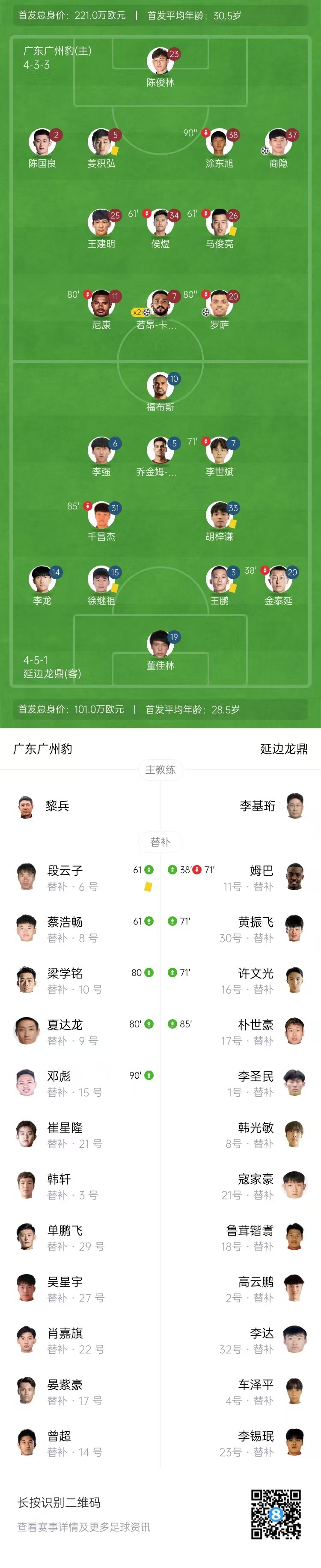 中甲-广东广州豹4-0延边龙鼎,取中甲队史首胜,商隐破门罗萨重炮