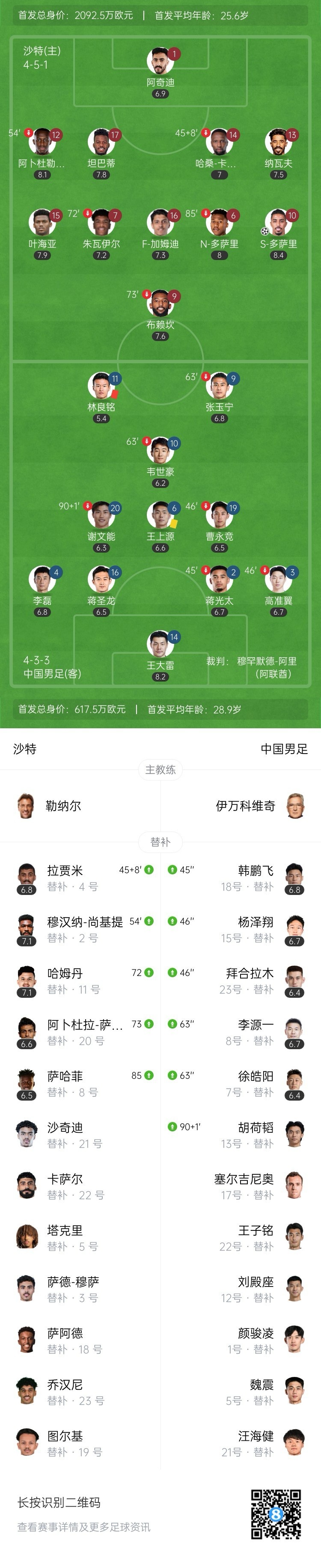 沙特进球手球在先无效!第38分钟,沙特战术角球开出,加姆迪后点头球被王大雷挡了一下,随后再补射破门!通过VAR,裁判吹罚加姆迪手球在先,进球无效!↓