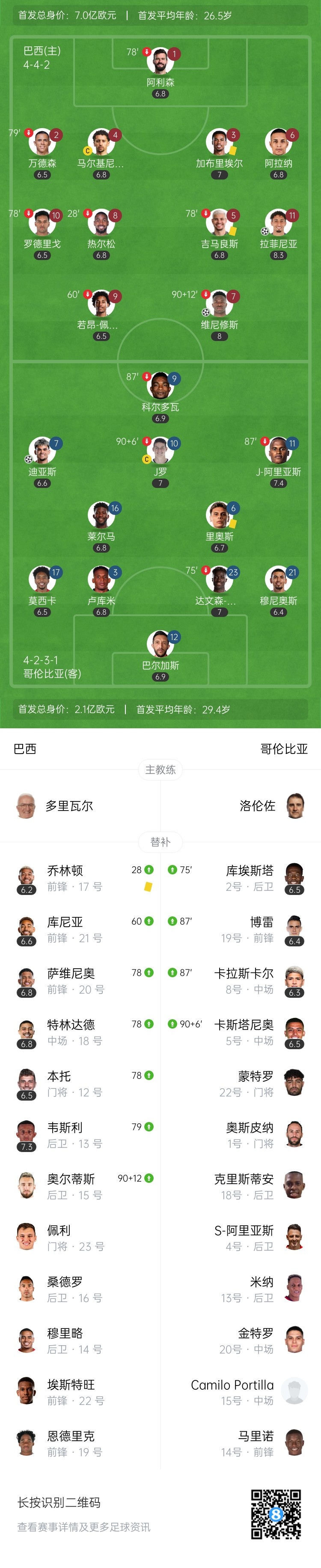 第40分钟,迪亚斯接J罗助攻低射扳平比分,哥伦比亚1-1巴西。↓