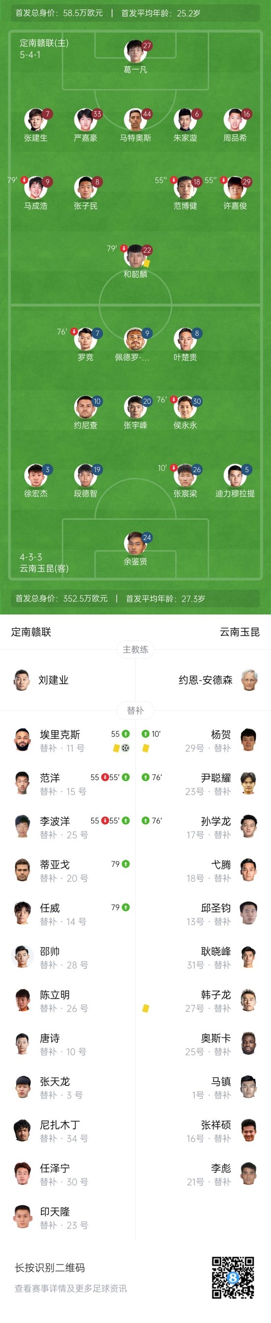 下半场易边再战,第47分钟,定南左路起球到禁区余鉴贤扑球不远点球点附近罗竞打门被门线解围。↓