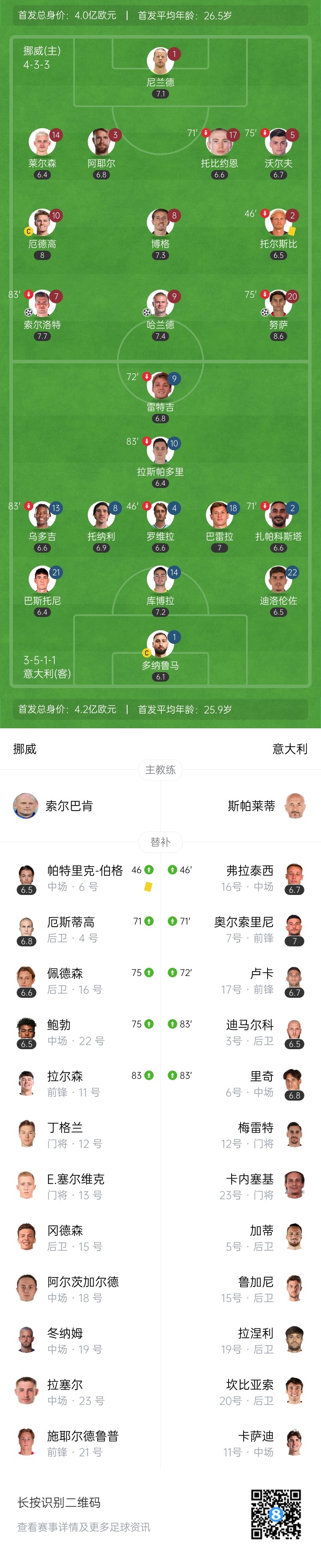第34分钟,努萨左路持球内切,禁区线附近右脚爆射攻破多纳鲁马大门!挪威2-0领先意大利↓
