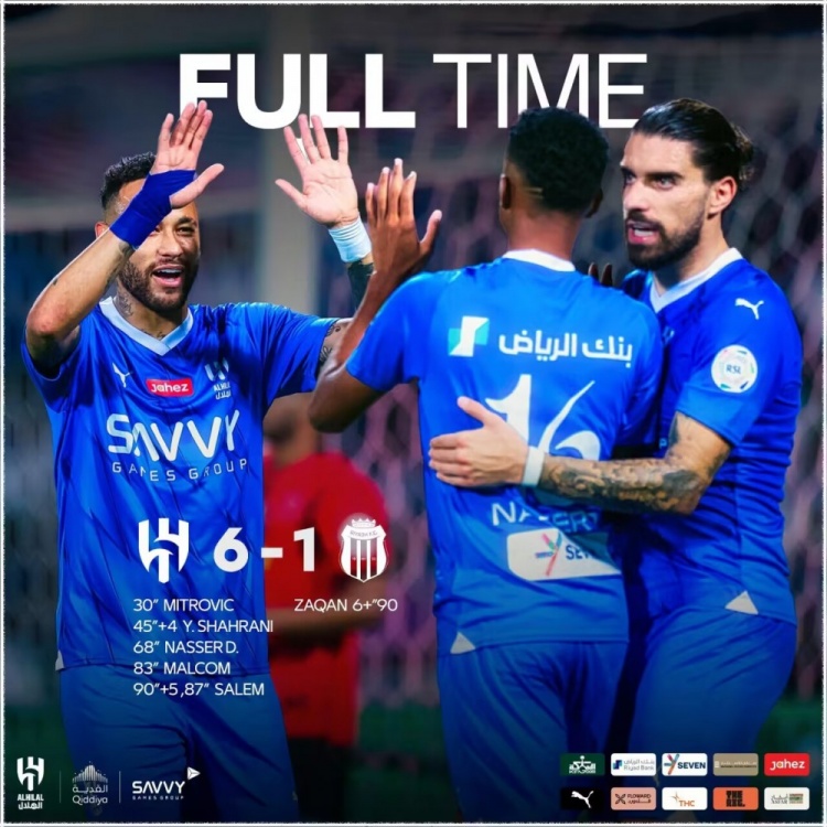第96分钟,阿基尔左路传中,格雷门前推射被布努挡出,阿里再补射破门,利雅得新月6-1利雅得体育!↓