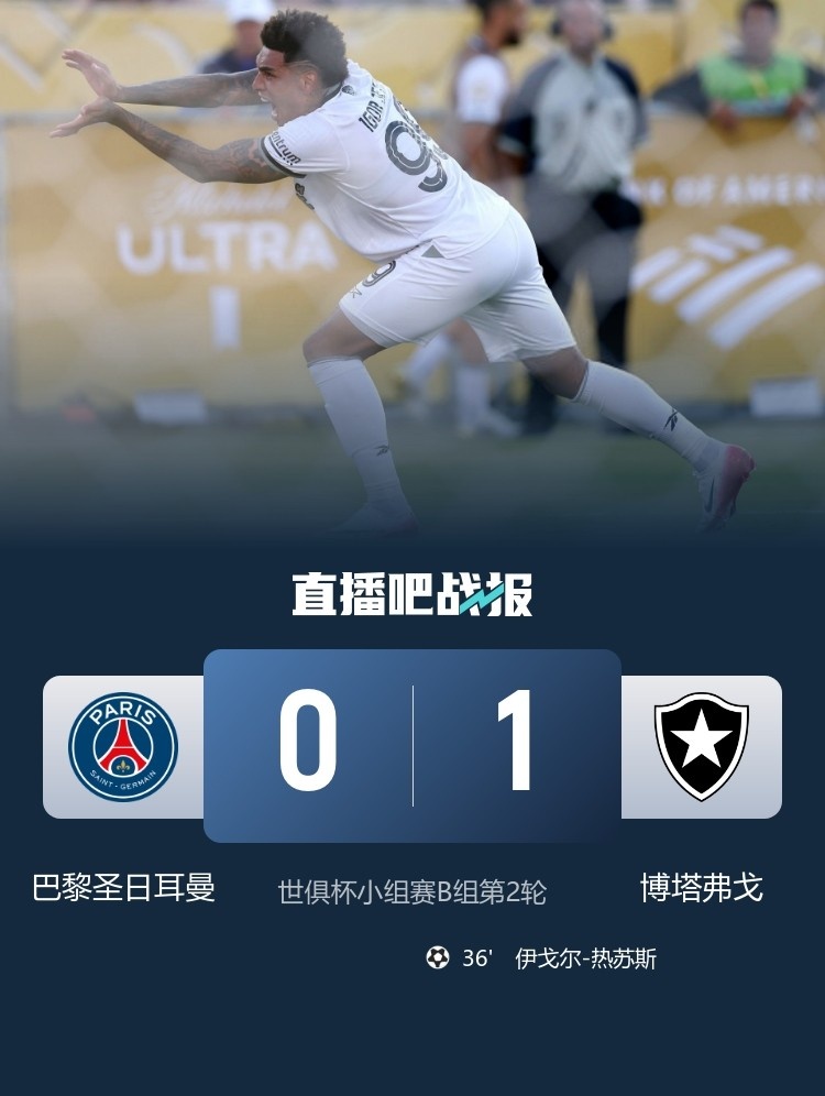 6月20日讯 北京时间6月20日上午9:00,世俱杯小组赛B组第2轮,巴黎圣日耳曼在玫瑰碗球场对阵博塔弗戈。上半场,伊戈尔-热苏斯破门。下半场,巴尔科拉越位进球,巴黎反扑无果。全场比赛结束,巴黎0-1博塔弗戈。本场过后,巴黎吃到首败,积3分排名小组第2,博塔弗戈2战全胜积6分升至榜首。
