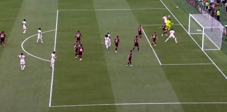第65分钟,弗拉门戈右路角球开到禁区,后点恩里克头球摆渡回门前,达尼洛跟进凌空垫射入网,弗拉门戈3分钟2球反超比分↓